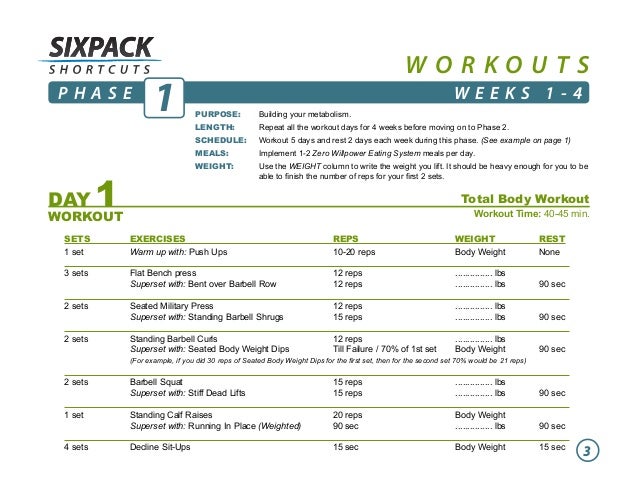 Sign in to your member account. Six Pack Shortcuts Workouts - Free download as PDF File pdf Text File txt or view presentation slides online. Lbs 90 sec 6 sets Preacher.